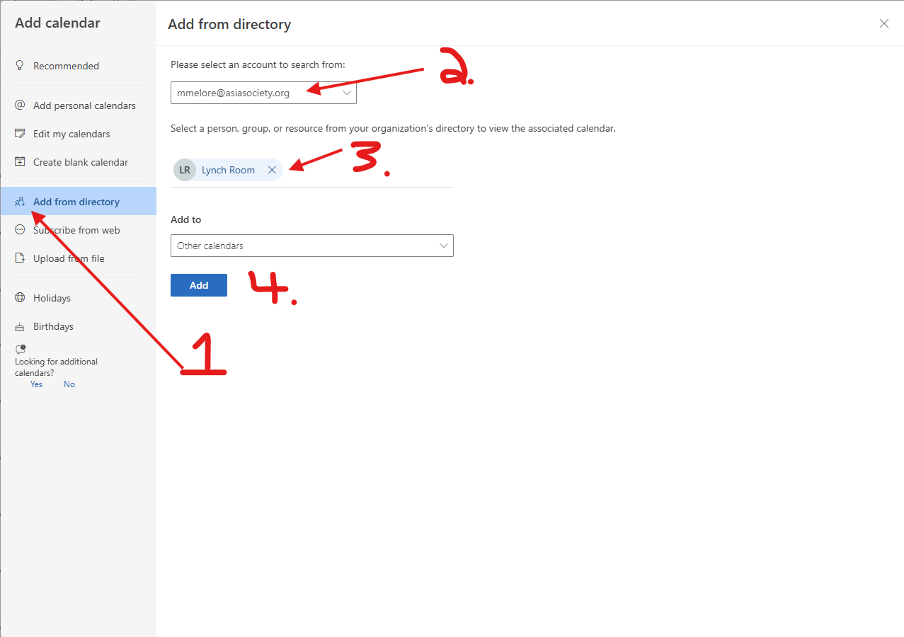 Web/New: Select Add from directory on the left hand side of the Window that comes up. Select the account (your account) you want to add the calendar to. Choose the email address you want to add by typing it in, or searching. Choose where you want it in your directory.