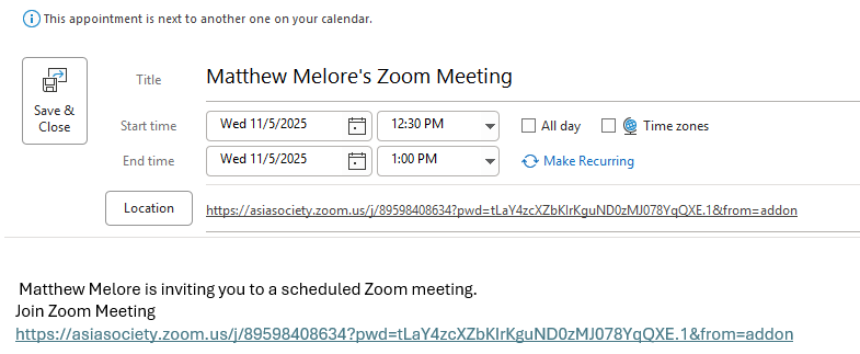 - It will either log you in or bring you to a browser to login with your Asia Society email address and password, you will then need to authenticate with the Microsoft Authenticator app. Then your Zoom details and link will appear in the Outlook calendar app.